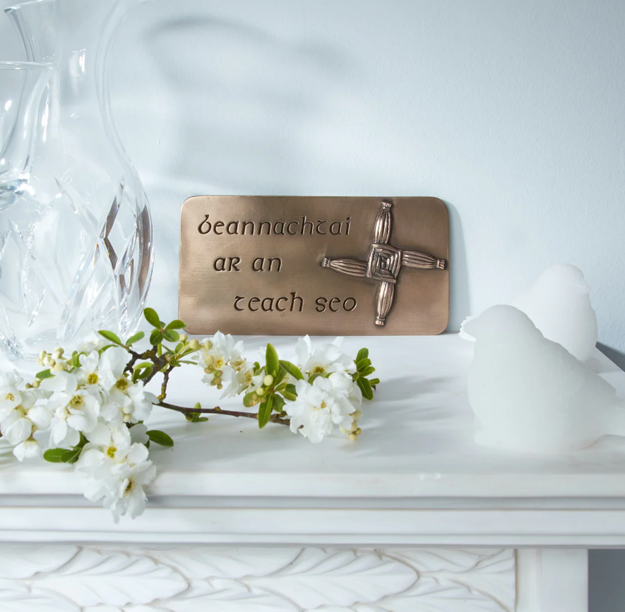 Usually woven from reeds, the St Brigid's Cross is thought to protect the home. This wall hanging comes with the Irish phrase, which means: blessings on this house. There are many folk traditions associated with St Brigid, which are still celebrated in rural Ireland.
