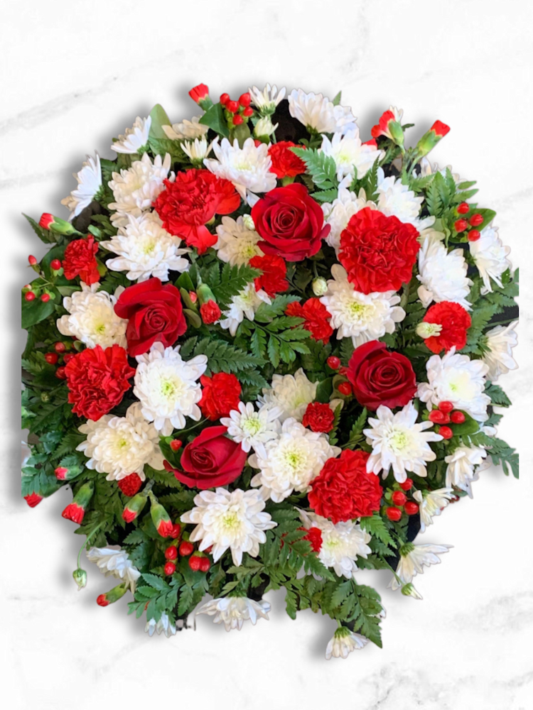 The circular shape of the wreath itself is a powerful symbol of eternity, unending love, and the cycle of life and death. The careful placement of each red rose, white rose, and red carnation within the verdant greens creates a balanced yet dynamic composition. The flowers are nestled amongst the foliage, allowing their individual beauty to shine while contributing to the overall harmony of the design.